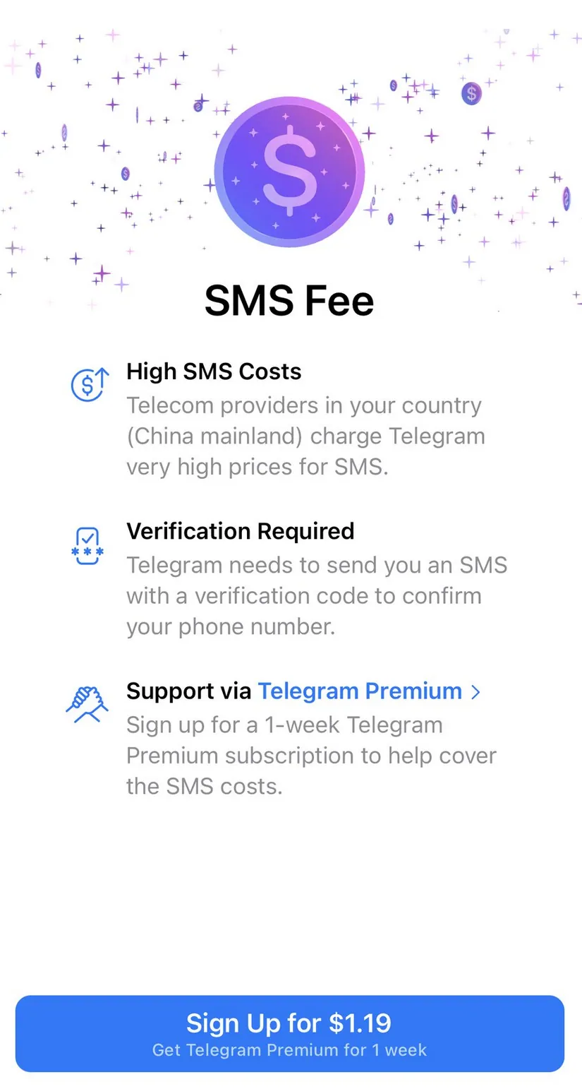 尽管提示中提到“SMS fee”(短信费用),这实际上不是真实的短信费用收取,而是Telegram用来过滤高风险登录的一种伪装策略。平台不会真正扣费,而是通过这个门槛来验证用户的真实性,如果你选择支付,它可能会进一步确认环境,但大多数情况下,这只是风控的表象。