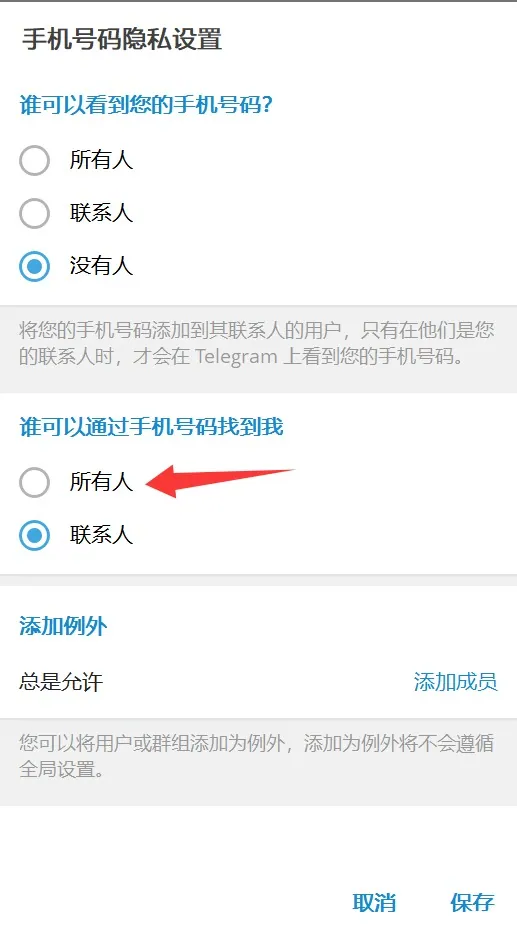 电报的隐私设置决定了别人能否通过手机号找到你: